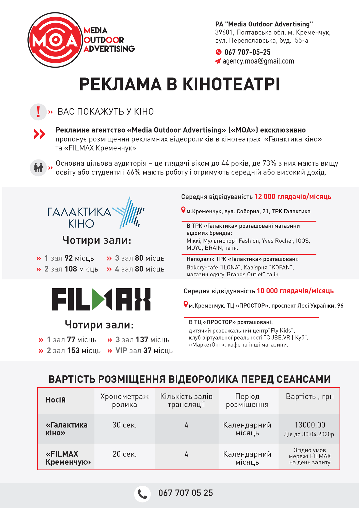 Релкама в кінотеатрі — це найкраща можливість для привернення уваги до Вашої компанії, товарів чи послуг. Рекламна агенція «МОА» пропонує розміщення відео реклами в багатозальних кінотеатрах у м. Кременчук.
